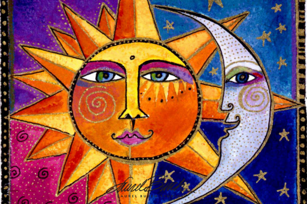 “Sister Sun, Brother Moon” captures the myths and magic of the celestial worlds in imagery of sun, moon and showers of shimmering stars. Laurel joyfully reminds us we all must let our orbits bump into one another. It is up to each of us to shine upon all beings who share our earth just as the sun and moon do.